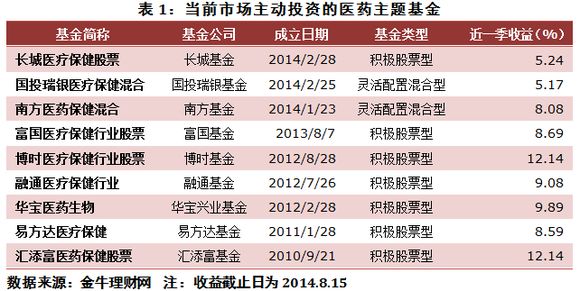 醫藥醫療主題基金的收益水平中長期穩健。成立時間較早的易方達醫療保健和匯添富醫藥保健股票近三年(截至2014.8.15)業績分別為23.98%和40.84%,分別跑贏同期滬深300指數59.94和43.08個百分點。融通醫療保健行業、華寶醫藥生物這兩只隨后成立的基金近兩年業績表現也相當優異,分別實現54.40%、38.82%的回報,比同期滬深300指數收益分別高出了53.16和37.57個百分點。